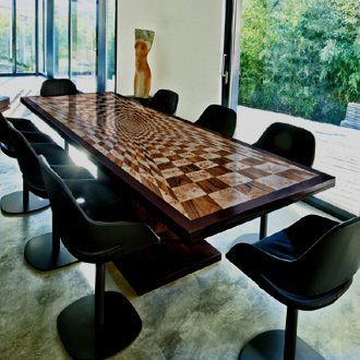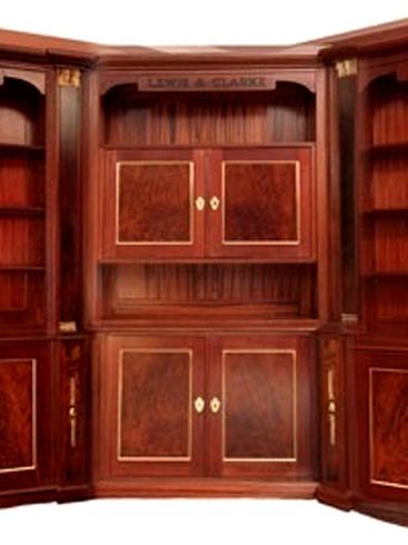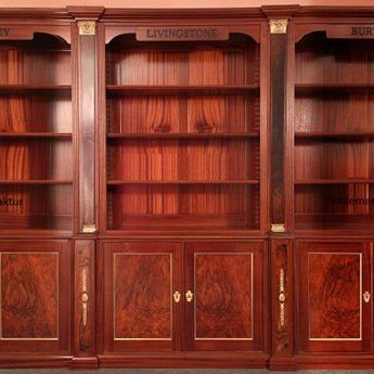 Bibliothek in Mahagoni mit Wurzelholzfüllungen, poliert. Zusätzlich stelle ich auch noch stilvolle Designermöbel her.